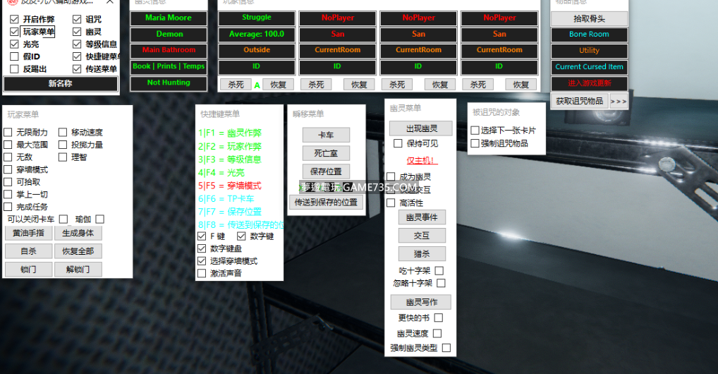 replyreload += ',' + 2311361; 支援版本:0.8.0.6 功能: 新名稱-修改玩家名字 無限耐力 移動速度修改 最大範圍 投擲力量 無敵 理智值修改 穿牆模式 等級資訊(顯示幽靈資訊 和 玩家資訊) 幽靈資訊(幽靈名