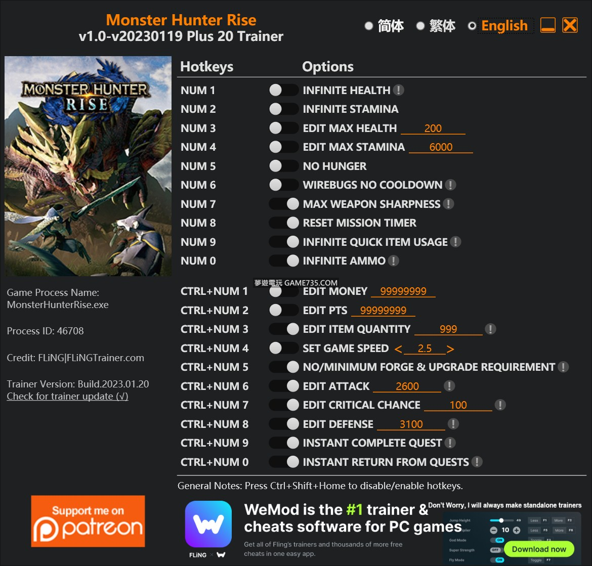 replyreload += ',' + 2312469; 數字鍵 1 - 無限生命值 數字鍵 2 - 無限耐力 Num 3 - 編輯最大生命值 Num 4 - 編輯最大耐力 數字鍵 5 - 沒有飢餓感 Num 6 - Wirebugs 無冷卻時間 數字鍵 7 - 最大武器鋒利度 Num 8