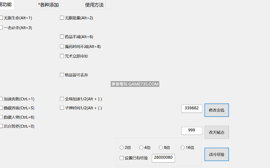 正文摘要:replyreload += ',' + 2313433;支援版本:Steam上的最新版本遊戲,失效時請更新修改器。 2023/02/14 v1.2.0:新增地圖上隨意傳送,調節坐標(可穿牆) 2023/02/14 v1.1.6:新增生命藥水,飛行坐騎,野獸工具,修正了之前新增東西可能出現的崩潰BUG 2023/02/13 v1.1.3:新增 修改天賦點數,新增掃帚,修正一些道具分類錯誤 2023/02/13 v1.1.0:新增 新增物品和裝備外裝等,物品皆可丟棄 2023/02/10 v1.0.1:新增 BUFF時間不減 咒術立即冷卻 2023/02/09 v1.0.0:發佈 修改器功能: 無限生命(Alt+1) 一擊必殺(Alt+3) 藥品不減(Alt+5) 魔藥時間不減 咒術立即冷卻 物品皆可丟棄 全域加速(Alt + ] ) 子彈時間(Alt + [ ) 加速奔跑(CtrL+1) 隱藏介面(CtrL+5) 隱藏人物模型(CtrL+6) 後台時暫停遊戲(CtrL+0) 修改金錢 修改天賦點 自訂經驗 多倍經驗 調節坐標 常見問題: 1. 所有功能都不能用:此種情況無一例外是被系統或防毒軟體阻止了,請把本工具加入到防毒軟體的信任區域(白名單) 關閉殺軟是不行的,QQ管家、各種安全衛士以及系統自帶的Windows Defender都屬殺軟,加完後還無效則需要重啟電腦。 2.有的功能可以用,有的功能無效: 版本不符,請更換遊戲至修改器所對應的版本或聯絡作者以更新修改器 所有站內附件皆會附上安全掃描報告請會員查看純淨度百分比後判斷使用(adsbygoogle = window.adsbygoogle || []).push({});相關檔案須知:取得檔案前,請先詳細閱讀文章內容避免不必要錯誤與誤會發生。也可多參考文章討論樓層內容了解附件檔案相關討論資訊。 【此文章部分內容隱藏中】 解除隱藏說明教學點擊下方 繼續閱讀文章 後請仔細觀看文章內容 並依照指示進行下一步最後完成解除隱藏後系統會回到此文章自動顯示隱藏內容~繼續閱讀 replyreload += ',' + 2313433; |