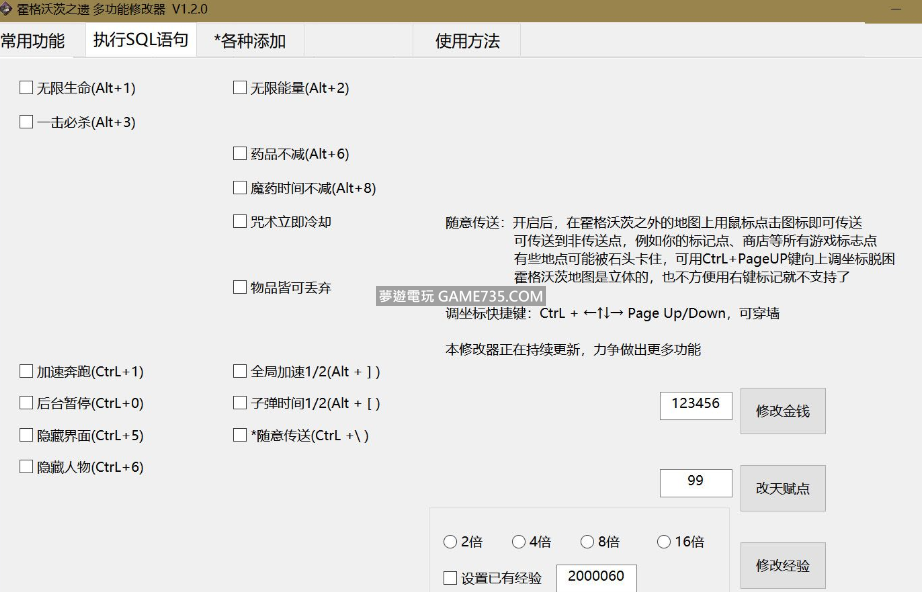 正文摘要:replyreload += ',' + 2313795;支援版本:Steam上的最新版本遊戲,失效時請更新修改器。 2023/02/19 v1.4.5:新增新增特質,咒語小遊戲立即完成,無限掃帚沖能 2023/02/18 v1.4.2:修改金錢和天賦點改用正確方法,修正新增咒語功能忘記執行問題 2023/02/17 v1.4.0:由於本人之前過於粗心,使用的新增方法都不完善,現開始陸續使用正確方法。 新增新增掃帚,外觀,魔杖,咒語,修正執行SQL語句功能實際無效問題 2023/02/16 v1.3.0:新增新增外觀、咒語,整合執行SQL語句功能,修正傳送無效問題 2023/02/14 v1.2.0:新增地圖上隨意傳送,調節坐標(可穿牆) 2023/02/14 v1.1.6:新增生命藥水,飛行坐騎,野獸工具,修正了之前新增東西可能出現的崩潰BUG 2023/02/13 v1.1.3:新增 修改天賦點數,新增掃帚,修正一些道具分類錯誤 2023/02/13 v1.1.0:新增 新增物品和裝備外裝等,物品皆可丟棄 2023/02/10 v1.0.1:新增 BUFF時間不減 咒術立即冷卻 2023/02/09 v1.0.0:發佈 修改器功能: 無限生命(Alt+1) 一擊必殺(Alt+3) 藥品不減(Alt+5) 魔藥時間不減 咒術立即冷卻 物品皆可丟棄 全域加速(Alt + ] ) 子彈時間(Alt + [ ) 加速奔跑(CtrL+1) 隱藏介面(CtrL+5) 隱藏人物模型(CtrL+6) 後台時暫停遊戲(CtrL+0) 修改金錢 修改天賦點 自訂經驗 多倍經驗 調節坐標 常見問題: 1. 所有功能都不能用:此種情況無一例外是被系統或防毒軟體阻止了,請把本工具加入到防毒軟體的信任區域(白名單) 關閉殺軟是不行的,QQ管家、各種安全衛士以及系統自帶的Windows Defender都屬殺軟,加完後還無效則需要重啟電腦。 2.有的功能可以用,有的功能無效: 版本不符,請更換遊戲至修改器所對應的版本或聯絡作者以更新修改器 所有站內附件皆會附上安全掃描報告請會員查看純淨度百分比後判斷使用(adsbygoogle = window.adsbygoogle || []).push({});相關檔案須知:取得檔案前,請先詳細閱讀文章內容避免不必要錯誤與誤會發生。也可多參考文章討論樓層內容了解附件檔案相關討論資訊。 【此文章部分內容隱藏中】 解除隱藏說明教學點擊下方 繼續閱讀文章 後請仔細觀看文章內容 並依照指示進行下一步最後完成解除隱藏後系統會回到此文章自動顯示隱藏內容~繼續閱讀 replyreload += ',' + 2313795; |