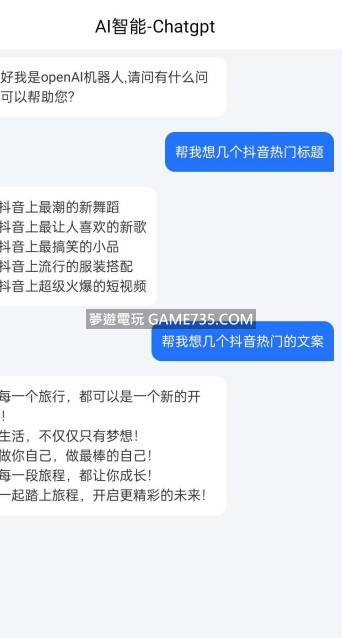 replyreload += ',' + 2314041;最近ChatGPT很火,親測已經可以運行了,自己開發了一個對接國外chatgpt官方api的國內版本,免註冊響應快,隨便用 【應用名稱】:ChatAi 【應用版本】:v1.0 【應用大小】:25m
