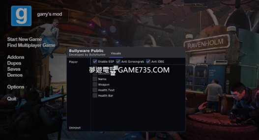replyreload += ',' + 2319171; 這是一個 ESP(墨西哥推銷軟件)的簡化版,包括一些已移除的功能以確保不會被檢測出來。 此軟件支援x64系統。 設置: 主開關 骨架 2D範圍/盒子/動態盒子 生命值(條形/文字) 名稱