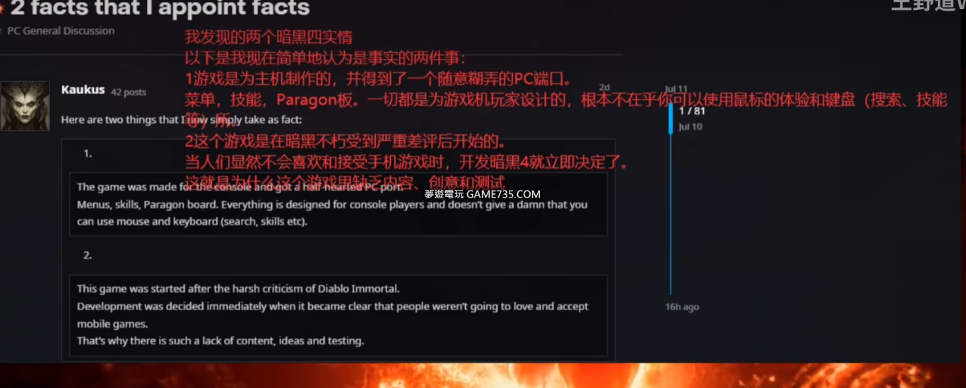 暴雪官方論壇公佈了兩個令玩家震驚的真相,關於暗黑4的情況。下面是關於這兩個真相的整理和分析: 綜上所述,暗黑4主要針對主機玩家並以圈錢為目的快速發佈。這解釋了目前遊戲面臨各種問題的主要原因。 .video