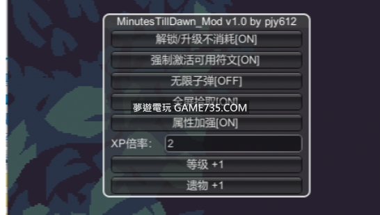replyreload += ',' + 2323898; 依賴 BepInEx x64 外掛。 將 BepInEx 放到遊戲根目錄。 請將外掛 MinutesTillDawn_Plugins.dll 放到 BepInEx\plugins 目錄中。 按F7啟動修改器。 V2.0: 支援Steam正式版(2023061
