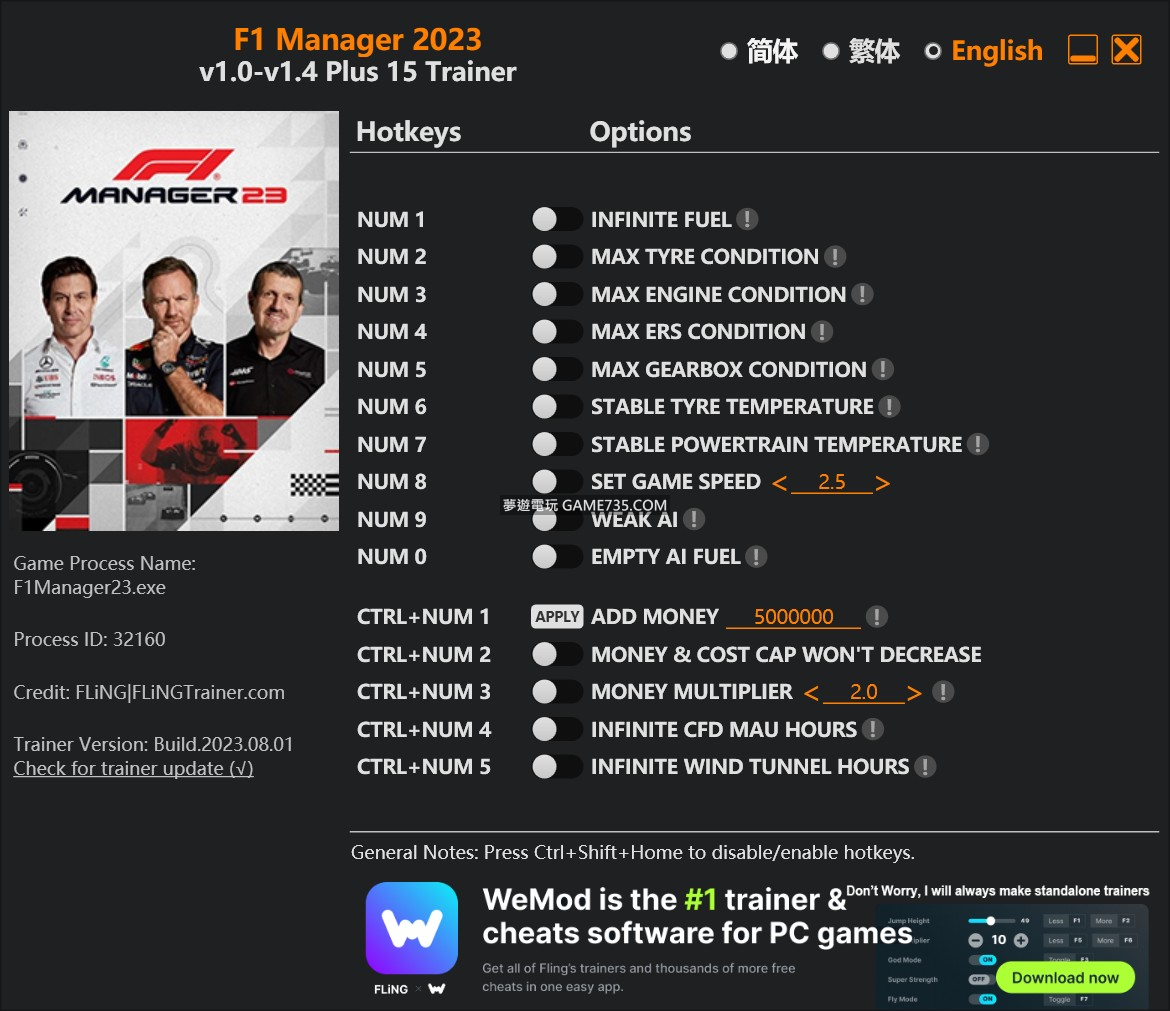 replyreload += ',' + 2324482; 數字 1 - 無限燃料 數字鍵 2 – 最大輪胎狀況 數字鍵 3 – 最大發動機狀況 數字鍵 4 – 最大 ERS 條件 數字鍵 5 – 變速箱最大狀況 數字鍵 6 – 穩定輪胎溫度 數字鍵 7 – 穩定的