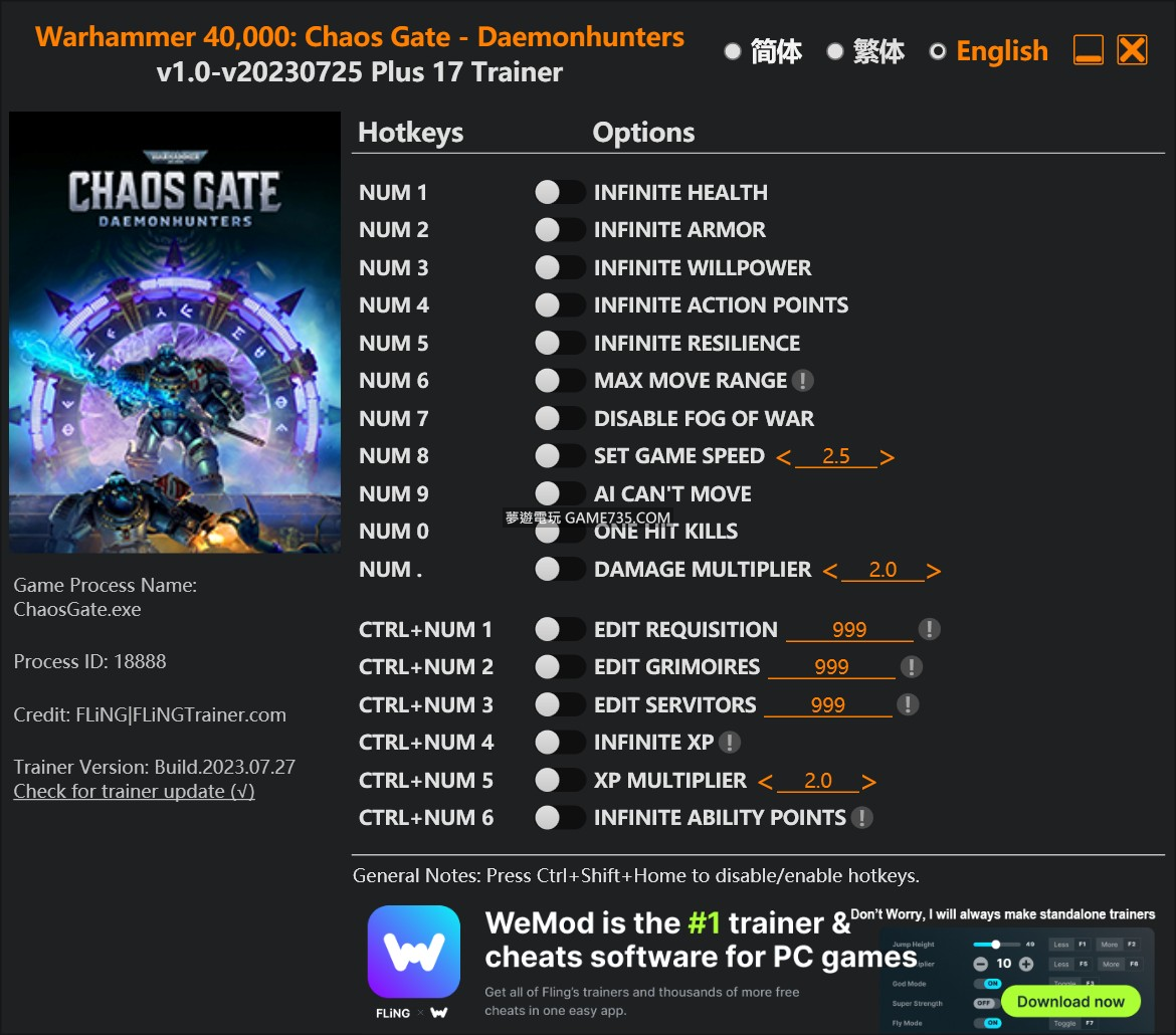 replyreload += ',' + 2324487;TRAINER +17 V1.0-V20230725 {FLING} 數字 1 – 無限生命值 數字鍵 2 - 無限護甲 數字鍵 3 - 無限意志力 數字鍵 4 - 無限行動點 數字鍵 5 - 無限恢復力 數字鍵 6 - 最大移動範圍
