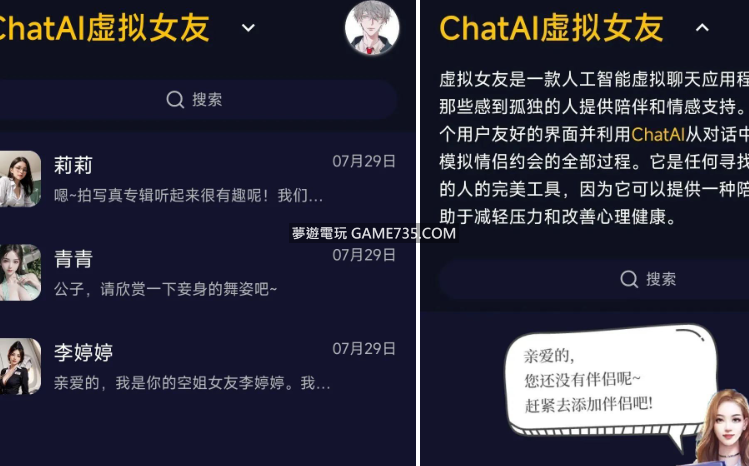replyreload += ',' + 2324532;一款AI虛擬聊天軟體--ChatAI虛擬女友,算是沾了chatgpt的春風吧 首次打開,會提示你當前還有沒有虛擬伴侶,需要去新增伴侶,然後首頁右上角可以設定自己的頭像和切換AI智能的模