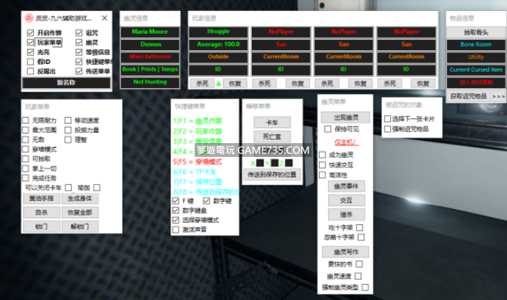 replyreload += ',' + 2326058; 功能: 新名稱-修改玩家名字 無限耐力 移動速度修改 最大範圍 投擲力量 無敵 理智值修改 穿牆模式 等級資訊(顯示幽靈資訊 和 玩家資訊) 幽靈資訊(幽靈名稱、幽靈類型、幽靈當前