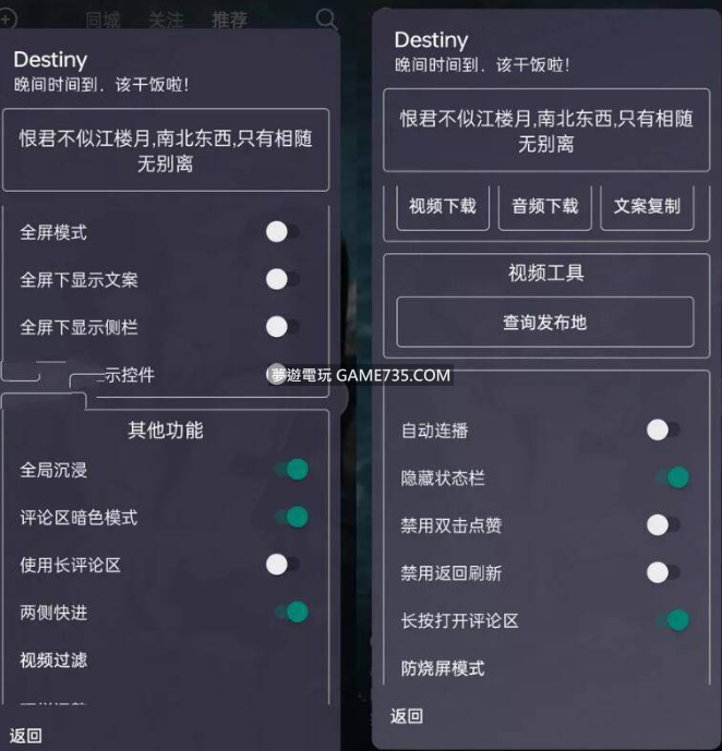 replyreload += ',' + 2326720; 抖音助手(Destiny)功能說明: 大部分功能類似抖音助手模組(抖音+,抖音土拔鼠外掛) 功能:防燒屏,全螢幕模式,自動播放,禁止點贊,全螢幕顯文案,視訊過濾,自訂頂欄標籤等; 使用:長按
