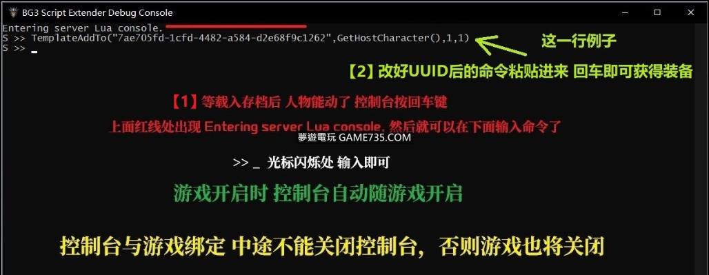 正文摘要:replyreload += ',' + 2327345;Script Extender Launcher 指令碼擴展器簡介 **** 此單獨Dll檔案無需其他前置即可 "具備裝MOD成就解鎖功能" **** 擁有開啟控制台功能,與遊戲無縫連接。具有直接刷裝備等功能 【指令碼擴展器 最下方下載】 Script Extender Launcher 指令碼擴展器 可以開啟控制台 --- 是下列MOD與許多功能性MOD的必要前置 注意: 這個指令碼擴展器與Achievement Enabler存在相同功能衝突。若用此請刪除\Baldurs Gate 3\bin\NativeMods 內"BG3AchievementEnabler.dll" ----------------------------------------------------------------------------------------------------------------------------------------------------------------------------------------------------------------------------------------- 自己從遊戲Hotfix4版本 換用此擴展器至今 一切正常 其他版本未知 ---- 【控制台使用】 遊戲中Alt+Tab切換出來即可看見控制台 Osi.PROC_CheckPartyFull() - 新增 - 擴充隊伍人數上限 和下面兩條命令 順序使用 SetMaxPartySizeOverride(X) - 新增 - 最大隊伍人數規模 X 自行更改所需數值 已測10人 其他數值自行測試 SetMaxPartySizeOverride(4) - 新增 -《 輸入完上兩條務必 輸入這一條》 Osi.TemplateAddTo("輸入物品UUID替換此處紅字",GetHostCharacter(),1,1) ⭐⭐⭐ 新增物品:後面紅色數字 1 改為自己所需的數量 可一次打幾行改好UUID程式碼的命令 貼上進控制台一次獲得多種物品 Osi.AddGold(GetHostCharacter(),800) ⭐【給當前人物增加800金幣】紅字 可自行更改 Osi.AddExplorationExperience(GetHostCharacter(),100) ⭐【給當前人物增加100經驗】紅字 可自行更改Osi.ChangeApprovalRating("人物UUID", GetHostCharacter(), 0, 100)複製代碼⭐⭐好感度命令【雙引號內人物UUID去掉改成隊友UUID】100 代表好感增加數值 AddTadpole(GetHostCharacter(),100) 【靈吸蟲威能數量 把紅色數字 100 改為自己所需數量】Osi.DB_ObjectCountHelper:Delete(GetHostCharacter(), "GEB_BusyDialog", -1)複製代碼【起源隊友無法對話請用此命令】Osi.PROC_GLO_InfernalBox_MoveBoxToCharacter(GetHostCharacter())複製代碼【這條程式碼可以丟掉影心遺物神器 讓她拿回去】適用於卡在地精橋上的人SetTadpoleTreeState(GetHostCharacter(), 2) 複製代碼【靈吸怪威能 之類Bug時 選擇有問題的角色並在控制台中使用此命令】 AddPassive(GetHostCharacter(), "NaturesStep_Dryad") 【把紅字自然步伐技能改為自己所需的技能名稱】Osi.TeleportTo("輸入NPC的UUID到雙引號內", GetHostCharacter())複製代碼【把目標NPC傳送到你身邊 雙引號內改為自己需要的人物UUID】Resurrect("輸入要復活人物UUID到雙引號內", "", 0)複製代碼【復活死亡的NPC雙引號內改成你需要復活人物的UUID】 MakeNPC("去掉紅字輸入隊友UUID直接讓她離隊") 【讓隊友直接離隊命令】 【安裝方法】 打開壓縮包把裡面檔案解壓至遊戲目錄"Baldurs Gate 3\bin"內即可 “控制台版 有2個檔案都要放進去” 【指令碼擴展器下載】 【二選一安裝 都具有裝MOD正常解鎖成就功能】 所有站內附件皆會附上安全掃描報告請會員查看純淨度百分比後判斷使用(adsbygoogle = window.adsbygoogle || []).push({});相關檔案須知:取得檔案前,請先詳細閱讀文章內容避免不必要錯誤與誤會發生。也可多參考文章討論樓層內容了解附件檔案相關討論資訊。 【此文章部分內容隱藏中】 解除隱藏說明教學點擊下方 繼續閱讀文章 後請仔細觀看文章內容 並依照指示進行下一步最後完成解除隱藏後系統會回到此文章自動顯示隱藏內容~繼續閱讀 ---- 此擴展器不支援較老的遊戲版本 ---- 已知版本4.1.1.3622274 不支援此指令碼901結尾版號也不行3635601之後的版本才能生效 【根據自己遊戲版本自行測試,不行的話 刪了即可】replyreload += ',' + 2327345; |