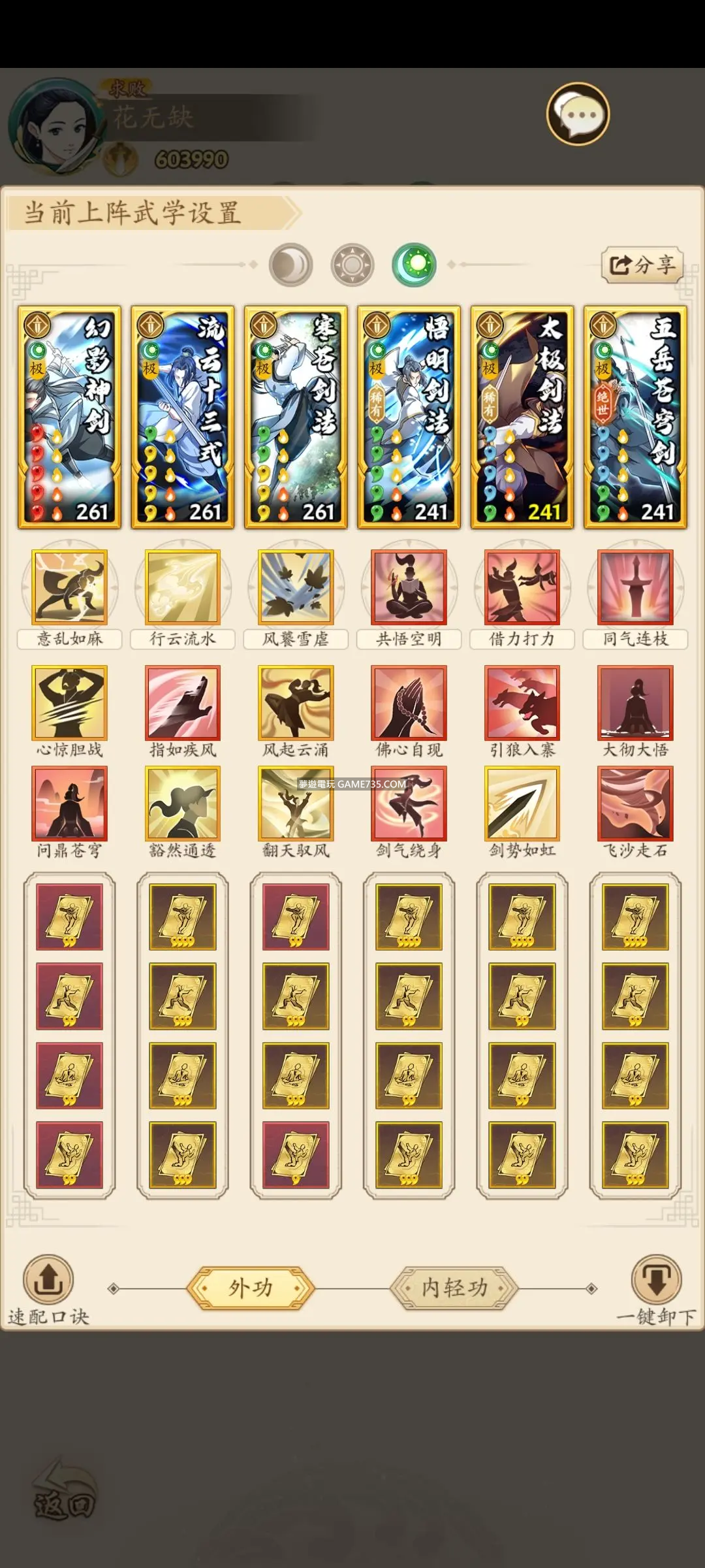 無名江湖攻略:完美調和劍的藝術 **一號位:《幻影神劍》** - 這個位置的劍法是能夠優勢先手的《幻影神劍》。 - 它帶有麻痹封對方的先後手招式,能讓對手心驚膽戰,同時也能使用七步分身術來觸發主動四系