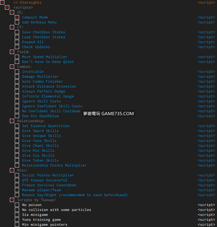 replyreload += ',' + 2327664; 新增功能: 設定精華數量 提供劍術技能 提供獨特技能 一擊必殺 忽略技能消耗 忽略同伴技能消耗 無同伴技能冷卻時間 提供 Yuna 技能 提供 Chani 技能 凍結生存倒數計時 重複白天