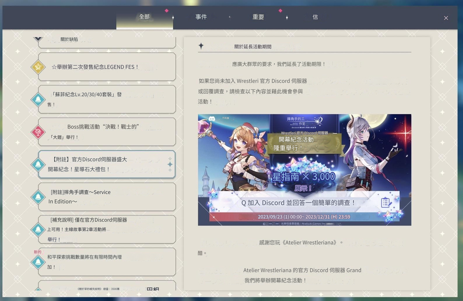replyreload += ',' + 2329443; 【蕾斯勒裡安娜的鍊金工房】 【消息】加入官方 Discord 並填寫簡單問券,即可獲得3000石!活動時間已延長。 現在, 知道了如何參加這個活動並獲得3000石。趕快加入官方 Discord,