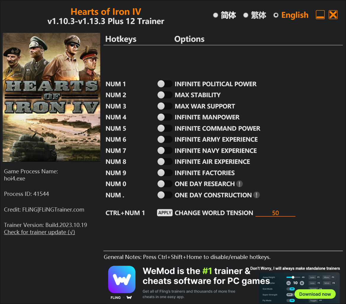 replyreload += ',' + 2330467; 12個選項·遊戲版本:v1.10.3-v1.13.3+·最後更新:2023.10.19 鋼鐵雄心 IV 訓練師/作弊選項 數字 1 – 無限的政治權力 數字鍵 2 - 最大穩定性 數字鍵 3 – 最大戰爭支持 數字鍵 4