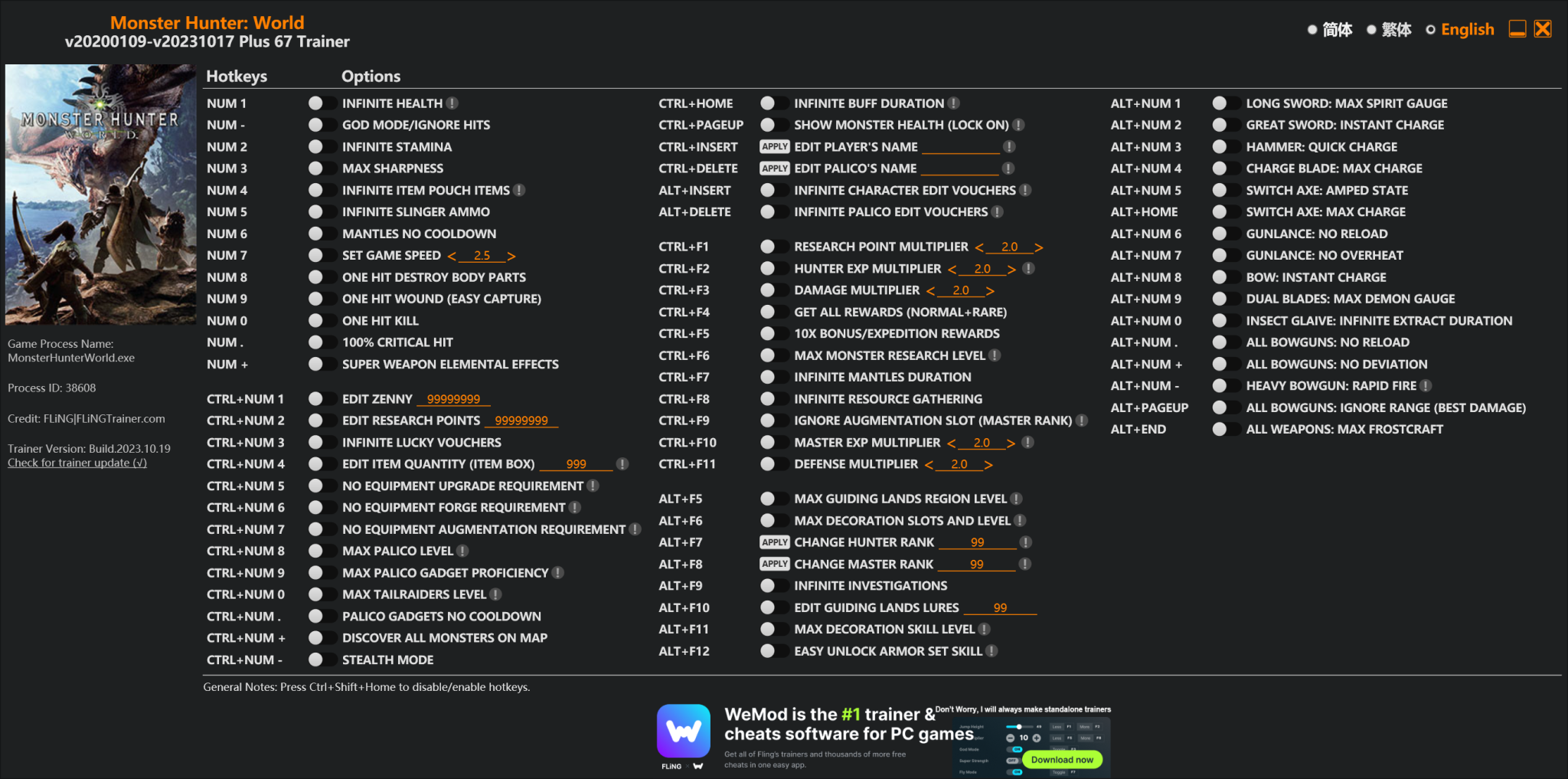 replyreload += ',' + 2330469; 67 選項 · 遊戲版本:v20200109-v20231017+ Iceborne DLC · 最後更新:2023.10.19 注意:僅限離線模式。 怪物獵人世界:冰原訓練師/作弊 選項 數字 1 – 無限生命值 Num – –
