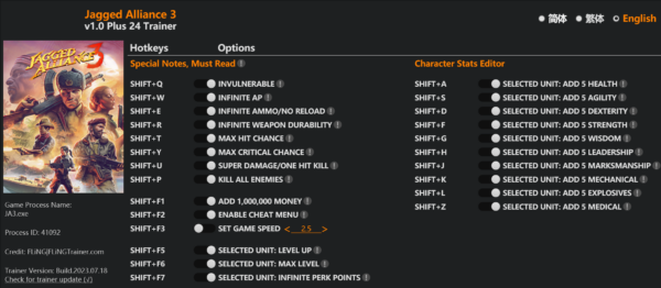replyreload += ',' + 2330484; Shift+Q – 無敵 Shift+W – 無限行動點 Shift+E – 無限彈藥/無需重新裝彈 Shift+R – 無限武器耐久度 Shift+T – 最大命中幾率 Shift+Y – 最大爆擊幾率 Shift+U – 一擊必殺
