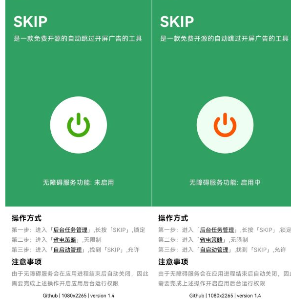 replyreload += ',' + 2331492; SKIP 是一款公益開放原始碼的Android應用,旨在利用 Android 無障礙服務幫助使用者快速點選 APP 開屏廣告的跳過按鈕,讓你的使用體驗更加流暢。 說明 點選螢幕中心按鈕跳轉無障礙