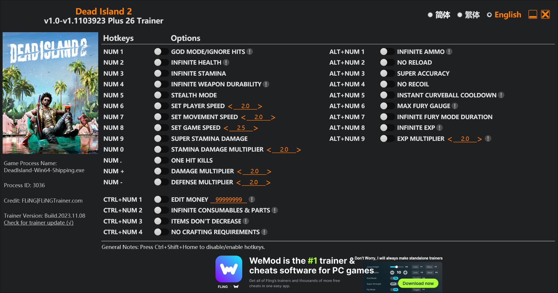 replyreload += ',' + 2332219; 選項 數字鍵 1 – 上帝模式/忽略命中 數字鍵 2 – 無限生命值 數字鍵 3 - 無限耐力 數字鍵 4 - 無限武器耐久度 數字鍵 5 - 隱身模式 數字鍵 6 – 設定玩家速度 數字鍵 7 – 設定移
