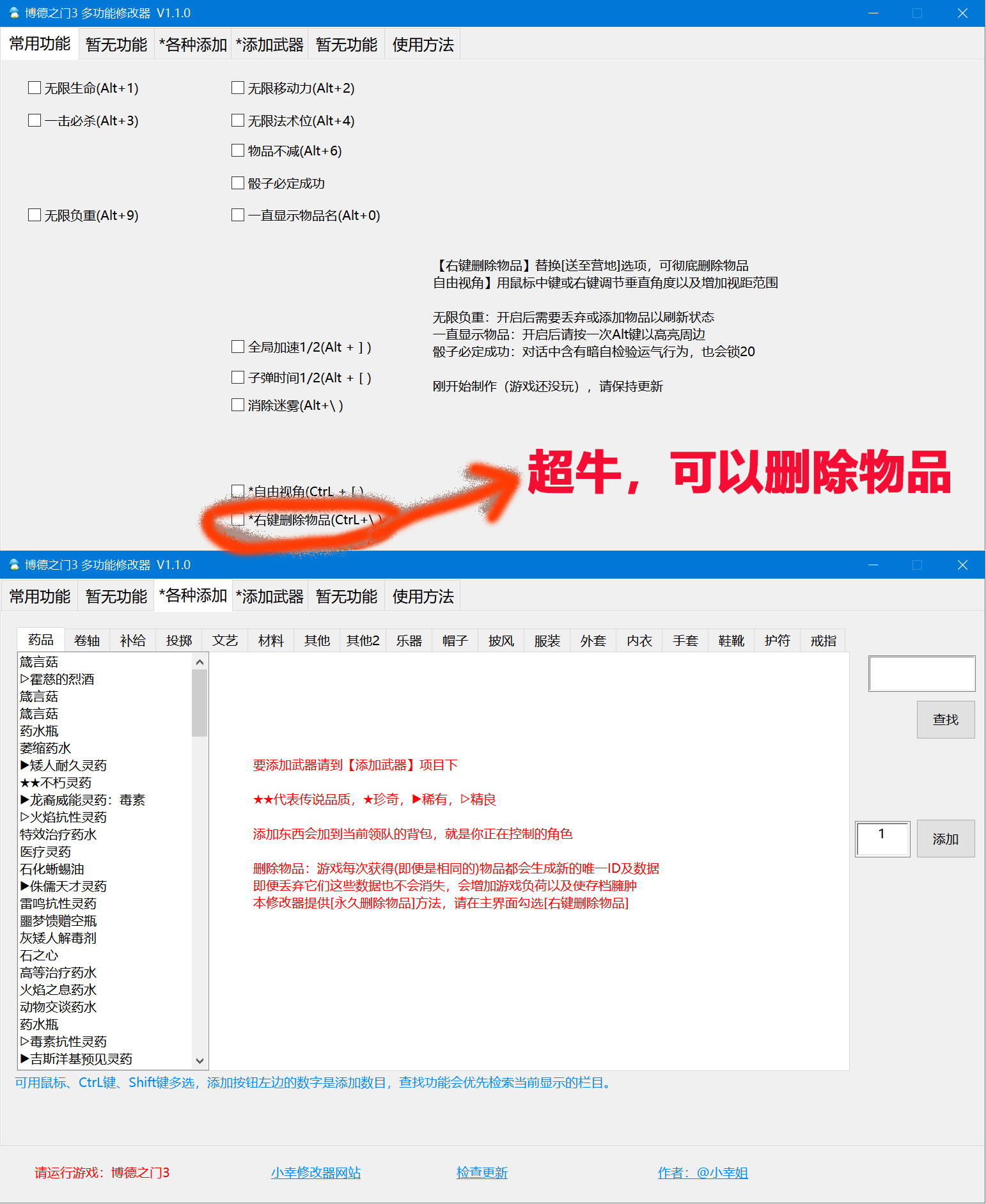 正文摘要:replyreload += ',' + 2333805; 2023/11/03 v1.2.0:更新大部分功能支援11月02日遊戲版本 所有站內附件皆會附上安全掃描報告請會員查看純淨度百分比後判斷使用(adsbygoogle = window.adsbygoogle || []).push({});相關檔案須知:取得檔案前,請先詳細閱讀文章內容避免不必要錯誤與誤會發生。也可多參考文章討論樓層內容了解附件檔案相關討論資訊。 【此文章部分內容隱藏中】 解除隱藏說明教學點擊下方 繼續閱讀文章 後請仔細觀看文章內容 並依照指示進行下一步最後完成解除隱藏後系統會回到此文章自動顯示隱藏內容~繼續閱讀 修改器功能: 無限生命(Alt+1) 無限移動力(Alt+2) 一擊必殺(Alt+3) 無限法術位(Alt+4) 骰子必定成功 無限負重(Alt+9) 物品不減(Alt+6) 多倍戰鬥經驗 一直顯示物品名 全域加速 子彈時間 右鍵刪除物品 自由視角 消除地圖迷霧 新增物品、武器、裝備 replyreload += ',' + 2333805; |