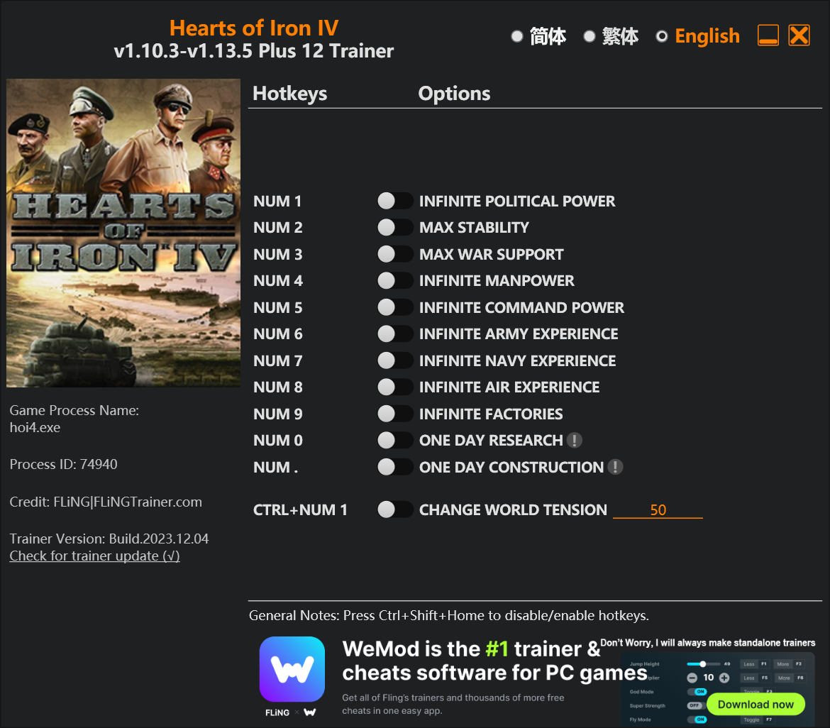 replyreload += ',' + 2334274; 12個選項·遊戲版本:v1.10.3-v1.13.5+·最後更新:2023.12.04 鋼鐵雄心 IV 訓練師/作弊選項 數字 1 – 無限的政治權力 數字鍵 2 - 最大穩定性 數字鍵 3 – 最大戰爭支持 數字鍵