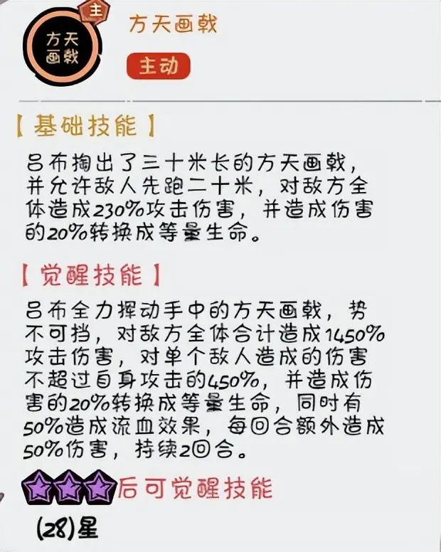 **呂布的技能分析:** 1. **巨斧砍擊 (一技能)** - 造成230%的全體傷害。 - 具有20%的回血優勢。 - 在面對多個敵人時,傷害和回血都非常強。 - 在單個目標