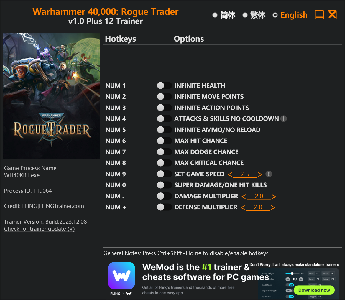 replyreload += ',' + 2334783; 選項 數字 1 – 無限生命值 數字鍵 2 - 無限移動點 數字鍵 3 - 無限行動點 數字鍵 4 – 攻擊和技能無冷卻 數字鍵 5 – 無限彈藥/無需裝彈 數字鍵 6 - 最大命中率 數字鍵 7 – 最大