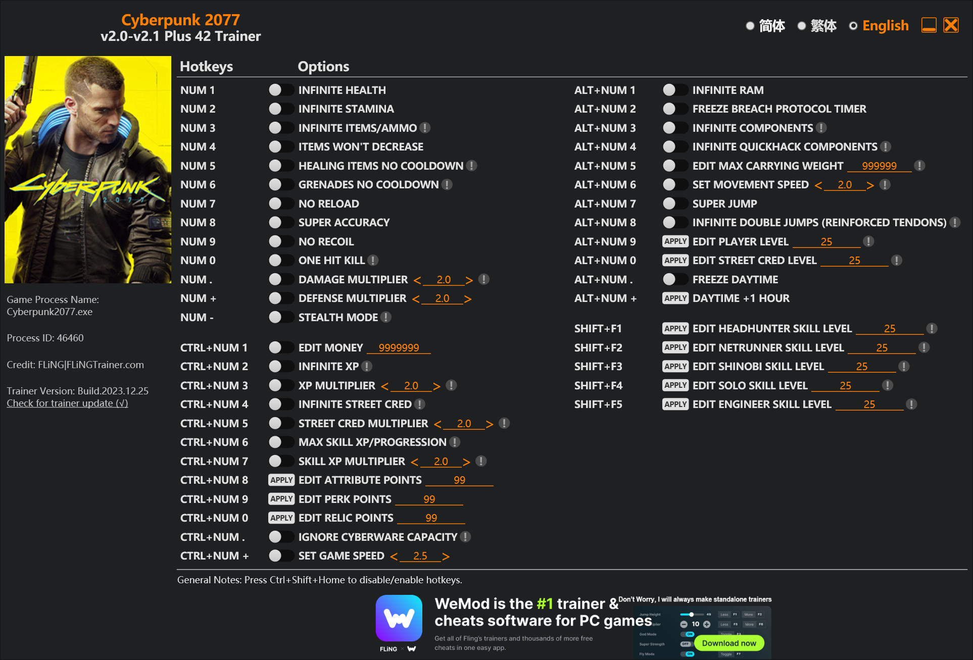 正文摘要:replyreload += ',' + 2335824;42選項 · 遊戲版本:v1.03-v2.1+ · 最後更新:2023.12.25 《Cyberpunk 2077》訓練家/作弊選項 數字 1 – 無限生命值 數字鍵 2 - 無限耐力 數字鍵 3 – 無限物品/彈藥 數字鍵 4 – 物品不會減少 數字鍵 5 – 治療物品無需冷卻 數字鍵 6 - 手榴彈無需冷卻 數字鍵 7 – 不可重新裝彈 數字鍵 8 – 超級精準 數字鍵 9 – 無後座力 數字鍵 0 – 一擊必殺 編號。 – 傷害倍數 Num + – 防禦倍數 Num – – 隱身模式 Ctrl+數字鍵 1 - 編輯金錢 Ctrl+數字鍵 2 – 無限 XP Ctrl+數字鍵 3 – XP 乘數 Ctrl+數字鍵 4 – 無限街頭信譽 Ctrl+數字鍵 5 – 街道信譽乘數 Ctrl+數字鍵 6 – 最大技能 XP/進度 Ctrl+數字鍵 7 - 技能經驗值倍增 Ctrl+數字鍵 8 - 編輯屬性點 Ctrl+數字鍵 9 - 編輯加成點 Ctrl+數字鍵 0 – 編輯遺跡點 Ctrl+數字。 – 忽略網路軟體容量 Ctrl+Num + – 設定遊戲速度 Alt+數字鍵 1 – 無限 RAM Alt+數字鍵 2 – 凍結違反協定計時器 Alt+數字鍵 3 – 無限組件 Alt+數字鍵 4 – 無限 Quickhack 組件 Alt+數字鍵 5 – 編輯最大承載重量 Alt+數字鍵 6 – 設定移動速度 Alt+數字鍵 7 – 超跳躍 Alt+數字鍵 8 – 無限二段跳(強化肌腱) Alt+數字鍵 9 – 編輯玩家等級 Alt+數字鍵 0 – 編輯街道信譽等級 Alt+數字。 – 結凍白天 Alt+Num + – 白天 +1 小時 Shift+F1 – 編輯獵人頭技能等級 Shift+F2 – 編輯 Netrunner 技能等級 Shift+F3 – 編輯忍者技能等級 Shift+F4 – 編輯獨奏技巧等級 Shift+F5 – 編輯工程師技能級別 所有站內附件皆會附上安全掃描報告請會員查看純淨度百分比後判斷使用(adsbygoogle = window.adsbygoogle || []).push({});相關檔案須知:取得檔案前,請先詳細閱讀文章內容避免不必要錯誤與誤會發生。也可多參考文章討論樓層內容了解附件檔案相關討論資訊。 【此文章部分內容隱藏中】 解除隱藏說明教學點擊下方 繼續閱讀文章 後請仔細觀看文章內容 並依照指示進行下一步最後完成解除隱藏後系統會回到此文章自動顯示隱藏內容~繼續閱讀 replyreload += ',' + 2335824; |