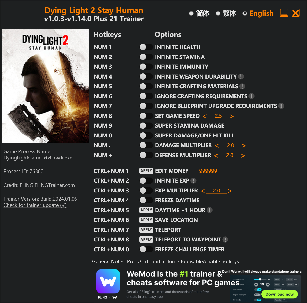 replyreload += ',' + 2336770; 選項 數字 1 – 無限生命值 數字鍵 2 - 無限耐力 數字鍵 3 - 無限免疫 數字鍵 4 - 無限武器耐久度 數字鍵 5 - 無限製作材料 數字鍵 6 – 忽略製作要求 數字鍵 7 – 忽略藍圖升級要