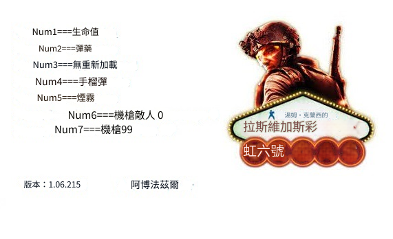replyreload += ',' + 2337031; Num1===生命值 Num2===彈藥 Num3===無重新加載 Num4===手榴彈 Num5===煙霧 Num6===機槍敵人 0 Num7===機槍99 湯姆·克蘭西的 拉斯維加斯彩 虹六號 版本:1.06.215 所有站內附