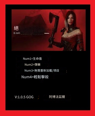 replyreload += ',' + 2337161; GOG版本用 絕 望-血咒- Num1=生命值 Num2=彈藥 Num3=無需重新加載/項目 Num4=輕鬆擊殺 V:1.0.5 GOG 所有站內附件皆會附上安全掃描報告請會員查看純淨度百分比後判斷使用(adsb