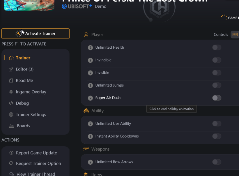 replyreload += ',' + 2337299; 波斯王子失落的王冠修改器(Prince of Persia: The Lost Crown)是一款用於電子遊戲《波斯王子:失落的王冠》的修改工具,它提供了一系列的遊戲內修改功能,可以讓玩家在遊戲中獲得各