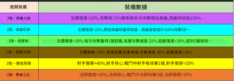 一、奧義流 在奧義流中,推薦的裝備選擇為:2階·奧義巨棒、2階·奧義之鎚、2階·超載槍、2階·超載倍鏡,以及兩位主C角色的核心裝備,或者是其他兩件增加全體傷害的裝備。這套裝備的特點是提高奧義技能的釋放概