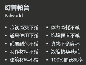 replyreload += ',' + 2338462;《幻獸帕魯(Palworld)》 十項修改器 2024.01.28 更新 遊戲名稱:幻獸帕魯(Palworld) 支援系統:Windows 10、11 支援版本:ver 0.1.3.0,理論支援後續版本 在遊戲世界中,為