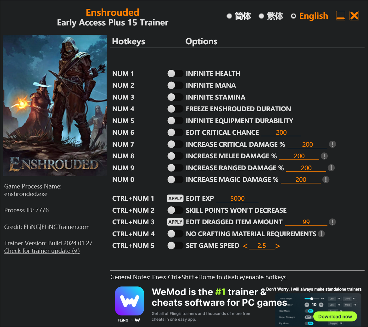 replyreload += ',' + 2338504;15 選項 · 遊戲版本:搶先體驗+ · 最後更新:2024.01.27 隱藏訓練師/作弊選項 數字 1 – 無限生命值 數字鍵 2 - 無限法力 數字鍵 3 - 無限耐力 數字鍵 4 - 冰凍籠罩持續時間 數字