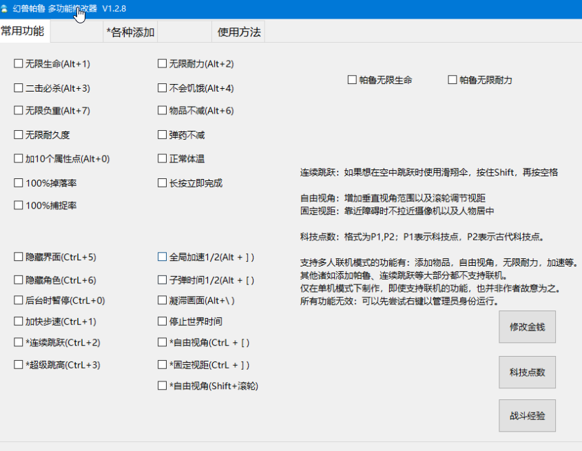 replyreload += ',' + 2338805;未加密解鎖版 《幻獸帕魯》多功能修改器 V1.2.8 更新日誌 2023年2月1日,更新版本1.2.8,修復了一個關於自訂星級和強化等級時HP沒有生效的問題。 2023年1月31日,更新版本1.2.6