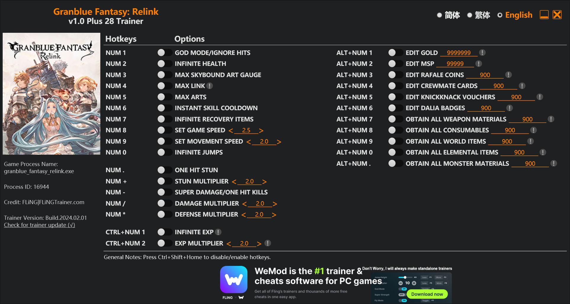replyreload += ',' + 2338876; 選項 數字鍵 1 – 上帝模式/忽略命中 數字鍵 2 – 無限生命值 數字鍵 3 - 最大天空藝術量表 數字鍵 4 - 最大連桿 數字鍵 5 – 最大藝術 數字鍵 6 - 技能即時冷卻 數字鍵 7 - 無限