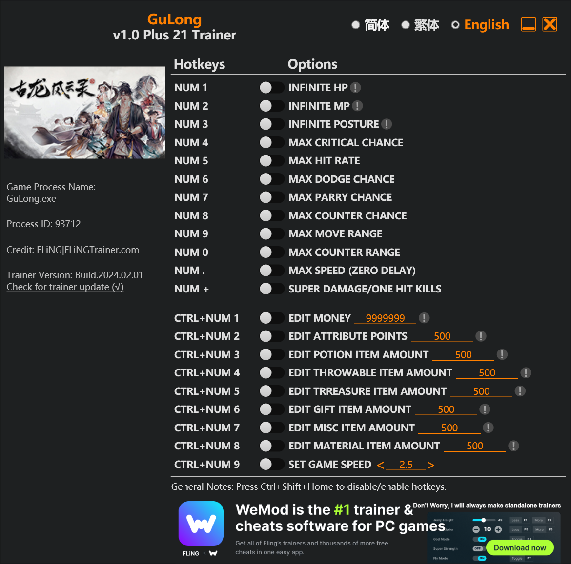 replyreload += ',' + 2338877; 選項 數字鍵 1 - 無限 HP 數字鍵 2 - 無限 MP 數字鍵 3 - 無限姿勢 數字鍵 4 - 最大暴擊率 數字鍵 5 - 最高命中率 數字鍵 6 – 最大閃避幾率 數字鍵 7 - 最大招架幾率 數字鍵 8 -