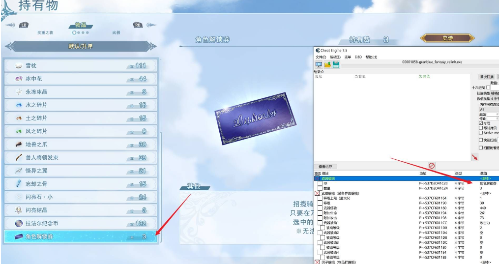replyreload += ',' + 2338991;碧藍幻想Relink 自用CT裡編輯道具有不少朋友說閃退,但作者用又沒問題的 所以弄了兩個表,閃退的朋友試試哪個可以用就用哪個吧 註: 剛玩到第五章,很多道具ID還沒弄,但改數量是沒
