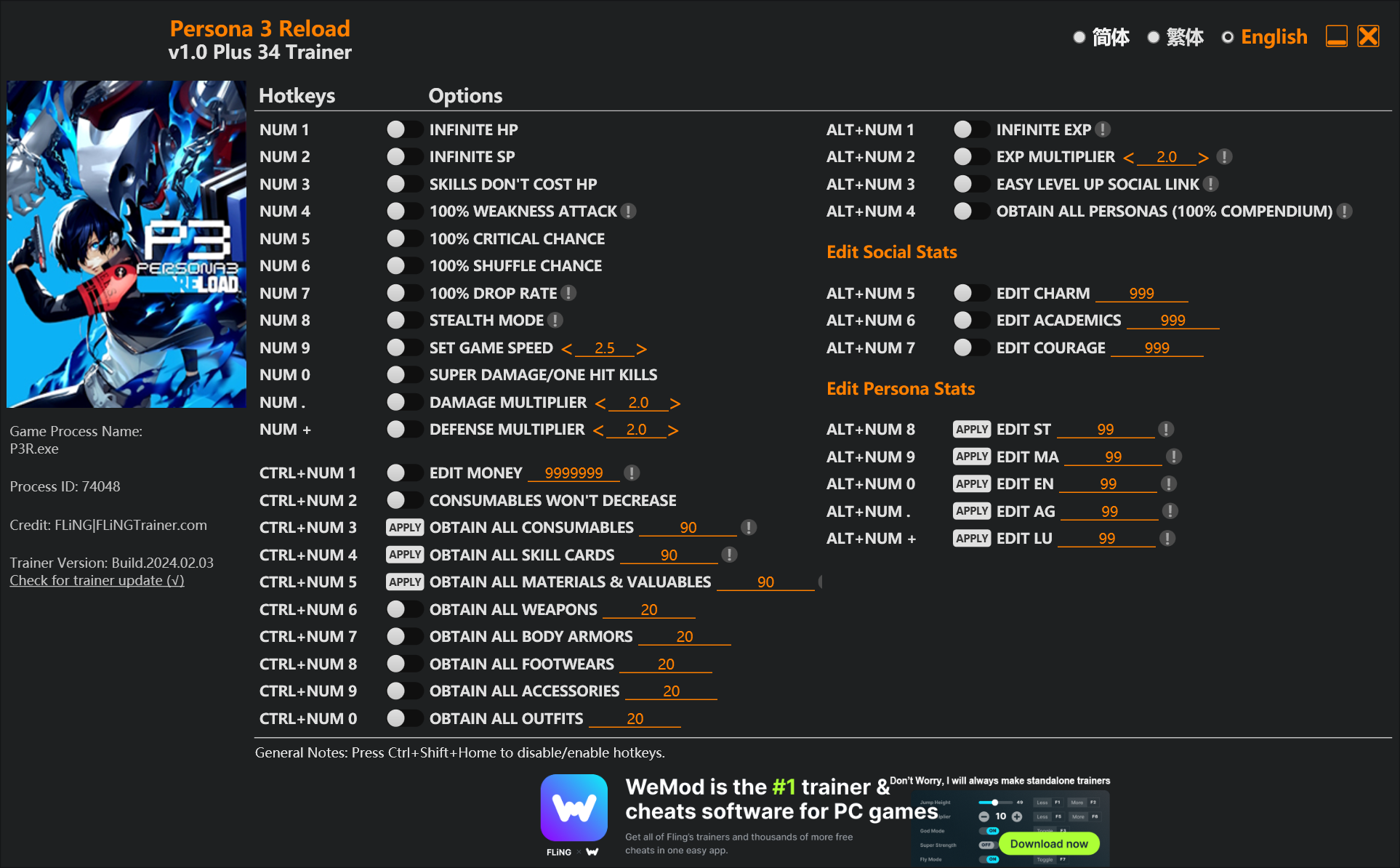 replyreload += ',' + 2339085;34 選項 · 遊戲版本:v1.0+ · 最後更新:2024.02.03女神異聞錄 3 Reload 訓練師/作弊 選項 數字鍵 1 - 無限 HP 數字鍵 2 - 無限 SP 數字 3 – 技能不消耗生命值 數字鍵 4 – 100%