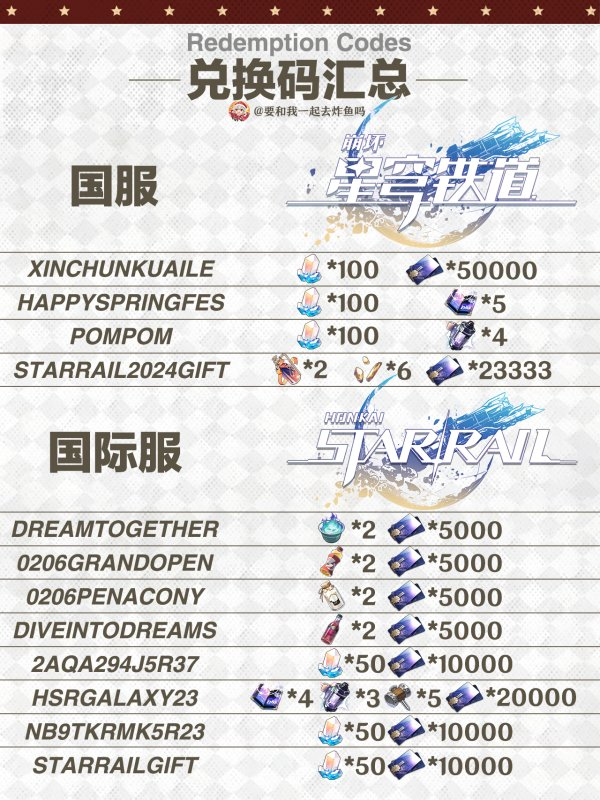 replyreload += ',' + 2339175;崩壞星穹鐵道|2024有效兌換碼大全一覽 在崩壞星穹鐵道這款受歡迎的遊戲中,玩家可以通過輸入兌換碼來獲得各種禮物和獎勵。以下是2024年的有效兌換碼一覽,分為國際服和陸服兩部分,讓