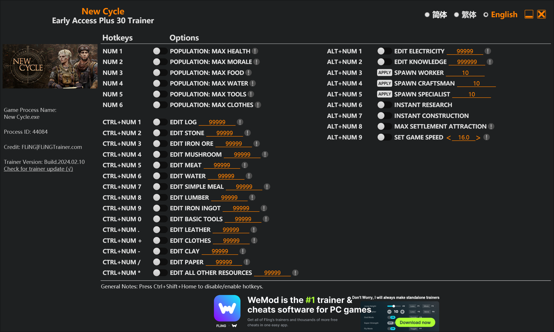 replyreload += ',' + 2339452; 30 選項 · 遊戲版本:搶先體驗+ · 最後更新:2024.02.10 新自行車訓練器/CheatOPTIONS 數字 1 - 人口:最大生命值 數字鍵 2 - 人口:士氣最高 數字鍵 3 - 人口:最大食物數 數