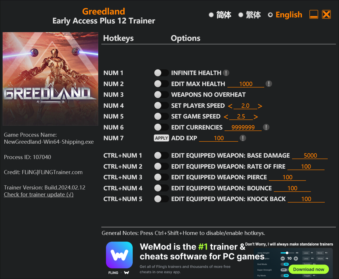 replyreload += ',' + 2339551; 12 個選項 · 遊戲版本:搶先體驗+ · 最後更新:2024.02.12 Greedland 訓練師/作弊 選項 數字 1 – 無限生命值 數字鍵 2 - 編輯最大生命值 數字鍵 3 – 武器不會過熱 數字鍵 4