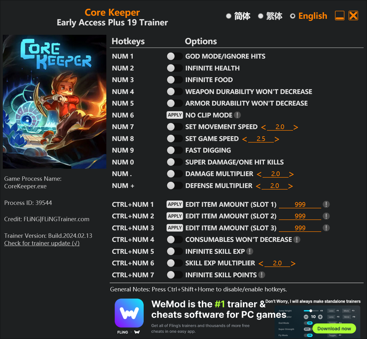 replyreload += ',' + 2339664;19 個選項 · 遊戲版本:搶先體驗+ · 最後更新:2024.02.13 注意:僅限單人遊戲模式。 核心守護者訓練師/作弊選項 數字鍵 1 – 上帝模式/忽略命中 數字鍵 2 – 無限生命值 數字鍵