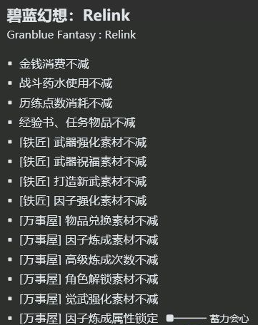 replyreload += ',' + 2339856; 遊戲名稱:碧藍幻想:RELINK(Granblue Fantasy: Relink) 支援系統:windows 10、11 支援版本:理論支援後續版本 修改內容: 01、商店金錢消費不減 02、戰鬥藥水使用不減 03