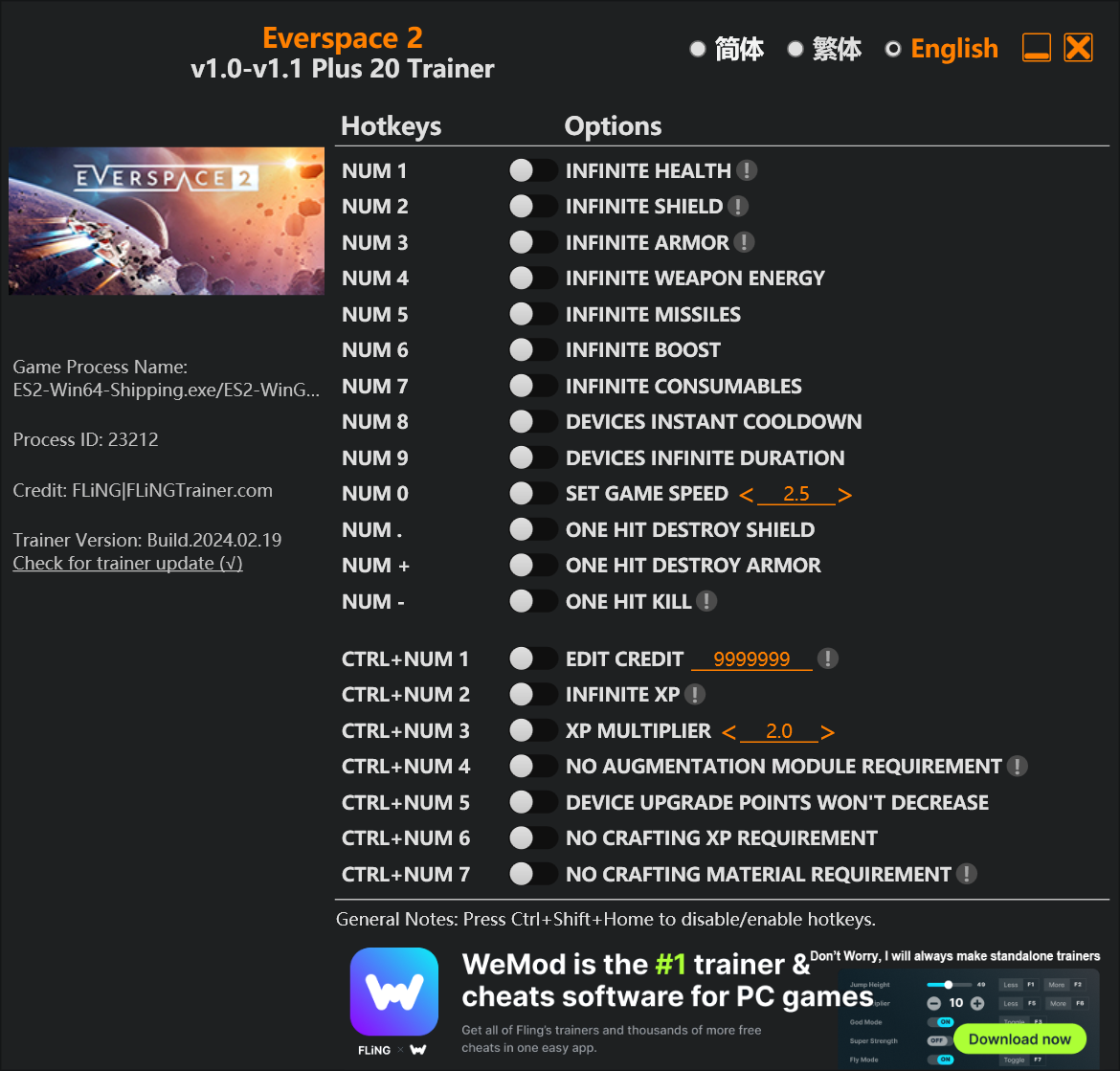 replyreload += ',' + 2339975; 20 個選項 · 遊戲版本:v1.0-v1.1+ · 最後更新:2024.02.19Everspace 2 訓練師/作弊 選項 數字 1 – 無限生命值 數字鍵 2 - 無限護盾 數字鍵 3 - 無限護甲 數字鍵 4 - 無限武器