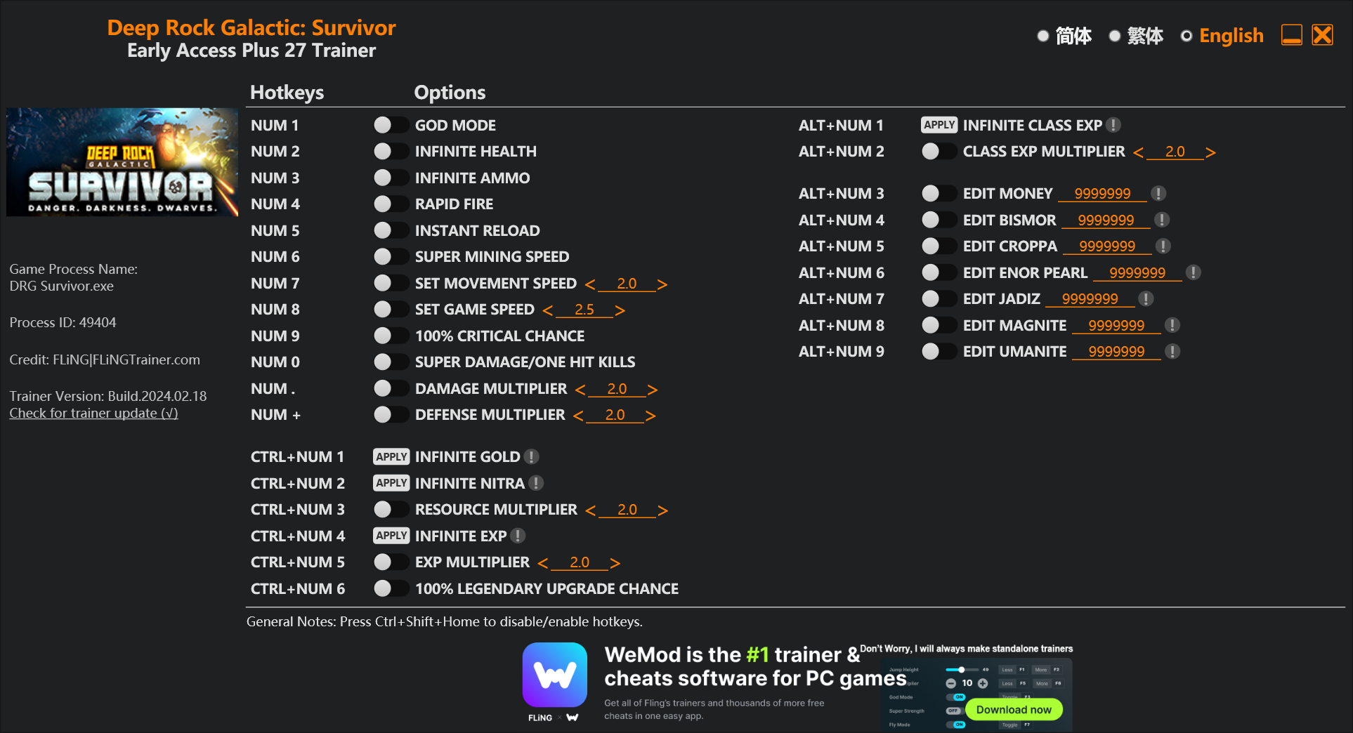 replyreload += ',' + 2339976; 27 選項 · 遊戲版本:搶先體驗+ · 最後更新:2024.02.18深岩銀河:倖存者訓練師/作弊 選項 數字鍵 1 – 上帝模式 數字鍵 2 – 無限生命值 數字鍵 3 - 無限彈藥 數字鍵 4 – 快