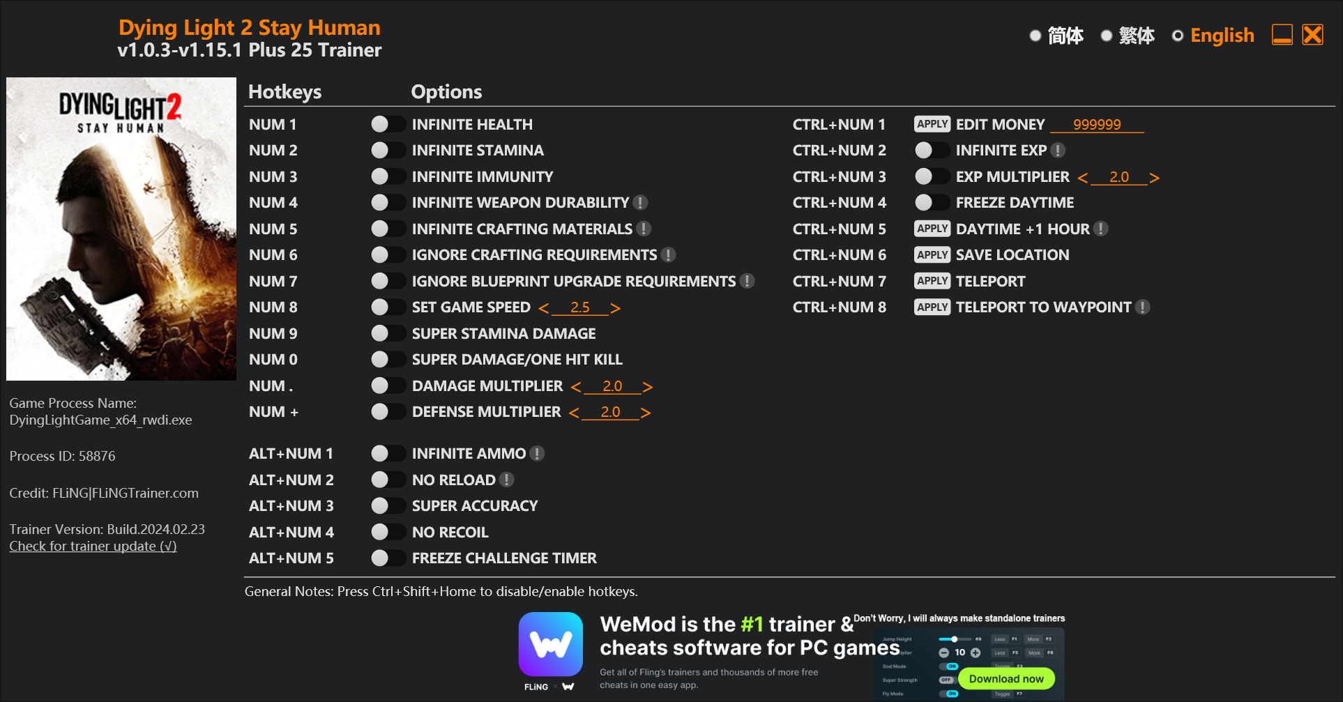 replyreload += ',' + 2340327; 25個選項 · 遊戲版本:v1.0.3-v1.15.1+ · 最後更新:2024.02.23 《消逝的光芒 2》保持人類訓練師/作弊選項 數字 1 – 無限生命值 數字鍵 2 - 無限耐力 數字鍵 3 - 無限免疫 數字