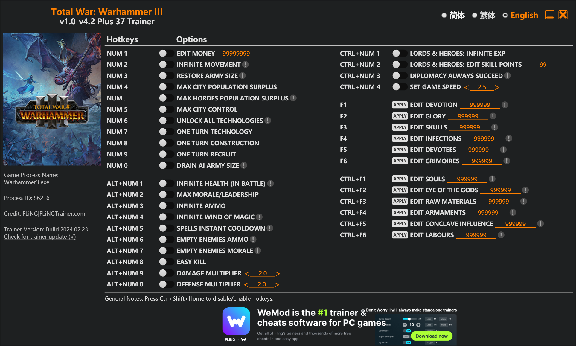 replyreload += ',' + 2340330;37選項 · 遊戲版本:v1.0-v4.2+ · 最後更新:2024.02.23 全面戰爭:戰鎚 III 訓練家/作弊選項 數字 1 – 編輯金錢 數字鍵 2 – 無限移動 數字鍵 3 - 恢復軍隊規模 數字鍵 4 – 最