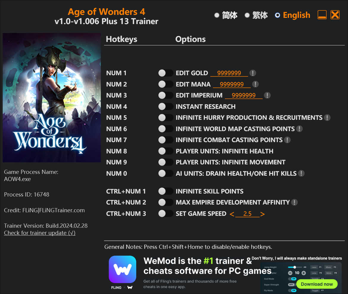replyreload += ',' + 2340854; 13個選項·遊戲版本:v1.0-v1.006+·最後更新:2024.02.28 Age of Wonders 4 訓練家/作弊選項 數字鍵 1 – 編輯金幣 數字鍵 2 - 編輯法力 數字鍵 3 - 編輯帝國 數字鍵 4 – 即時