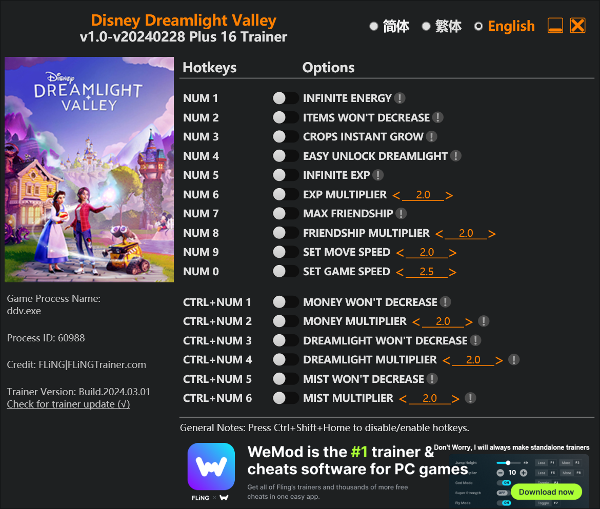 replyreload += ',' + 2340857; 16個選項·遊戲版本:v1.0-v20240228+·最後更新:2024.03.01 迪士尼夢光谷訓練師/作弊選項 數字 1 - 無限能量 數字鍵 2 – 物品不會減少 數字鍵 3 – 農作物即時生長 數字鍵 4